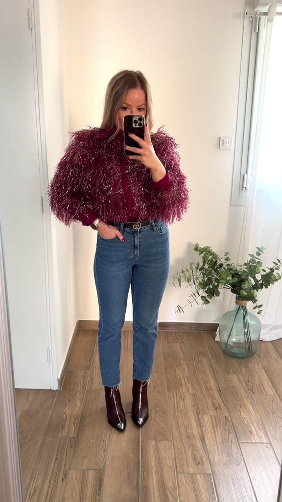 Chemise en plume bordeaux, avec des fils argentés.